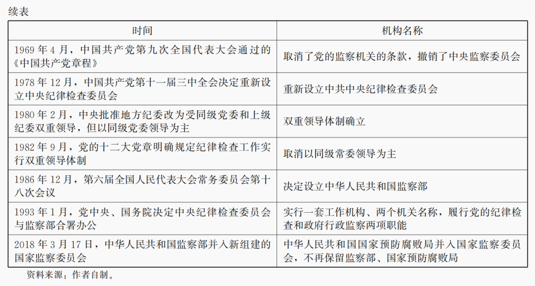 尽管本文试图重点对中国纪检监察机构改革的变迁动因进行分析,并尝试从治理视角给出解释,但是对于中国纪检监察机构改革的变迁过程描述是研究的前提。要描述中国纪检监察机构变迁过程,至少需要对以下三个方面进行阐述:一是对中国纪检监察机构在党的历史上的设立及其变迁过程进行描述;二是对中国纪检监察机构与同级党委和下级纪检监察机构之间领导关系进行描述;三是对中国纪检监察机构在党的系统设立和国家系统设立,以及两者之间关系进行描述。对这三个方面进行描述,可以很好地回答中国纪检监察机构发生了什么变迁?