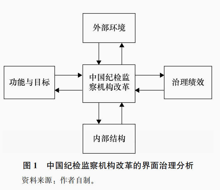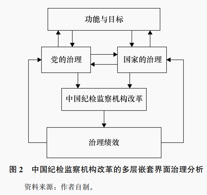 从图2可以看出,党的治理、国家的治理,以及党的治理和国家的治理之间关系都会影响中国纪检监察机构改革,它主要是通过对目标设定及其治理绩效来决策是否进行改革,采取何种程度的变革,以及是否需要进一步推动变革。从多层嵌套界面治理分析的视角看,中国纪检监察机构改革是更高层次治理界面对其目标与功能调整的产物,只要目标和功能定位发生变化,中国纪检监察机构就需要进行相应调整。在这一分析中,党的治理和国家的治理之间关系,尤其是如何重构党和国家治理体系,应该属于更高层次的治理界面,这种关系会决定党的治理和国家的治理各自边界,以及党的治理和国家的治理两者之间关系。