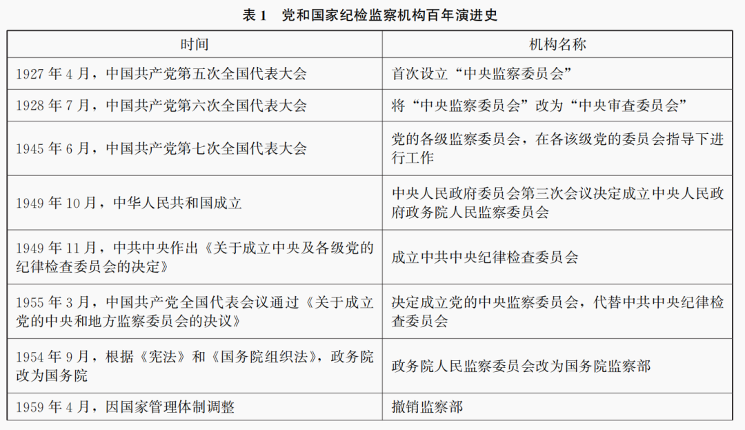 随着中国共产党革命取得胜利,并开始执政,这就面临着中国纪检监察机构在党的系统设立和国家系统设立之间的关系,它大致经历了三个阶段:分别设立;合署办公;成立国家监察委员会,推动党和国家监督制度体系建立。新中国成立之初,中国纪检监察机构在党的系统和国家系统中分别设立,中国纪检监察机构在国家系统中的设立最开始是人民监察委员会,随后修改为监察部,1959年撤销监察部,1986年开始重新设立监察部。从1993年开始,中央纪律检查委员会和监察部开始合署办公,这标志着中国纪检监察机构改革迈向新阶段,党和国家纪检监察机构之间协同成为重要议题。而2018年成立国家监察委员会则是对新中国成立之初的“人民监察委员会”的某种回归,也是国家监察体制系统建立的过程,对于推动中国纪检监察机构的成熟定型具有关键作用。